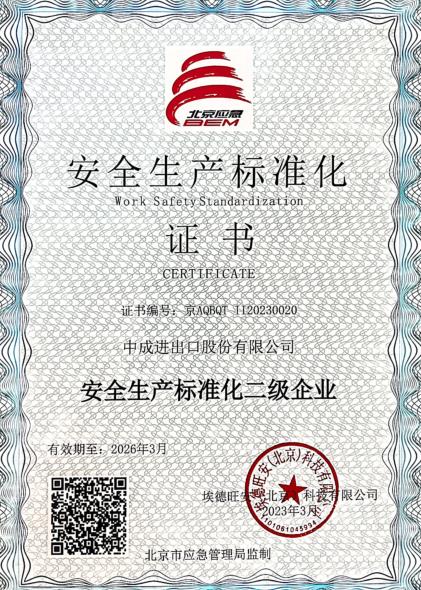 2023年4月3日,中成股份获颁新一期《安全生产标准化二级企业》证书(有效期三年),标志着此次安标证书复评及换证工作圆满结束。中成股份保持安标证书持续有效,为规范公司安全生产管理、提高企业整体管理水平、增强企业竞争力提供了有力的保障。