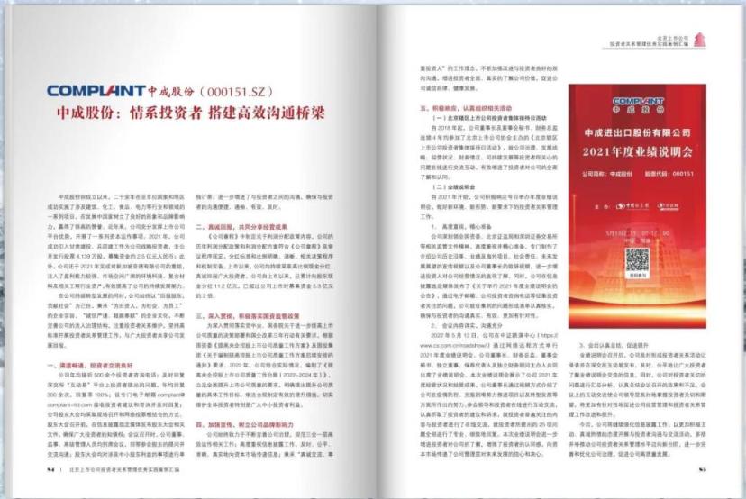 中成股份投资者关系管理实践案例入选《北京上市公司投资者关系管理优秀实践案例汇编》