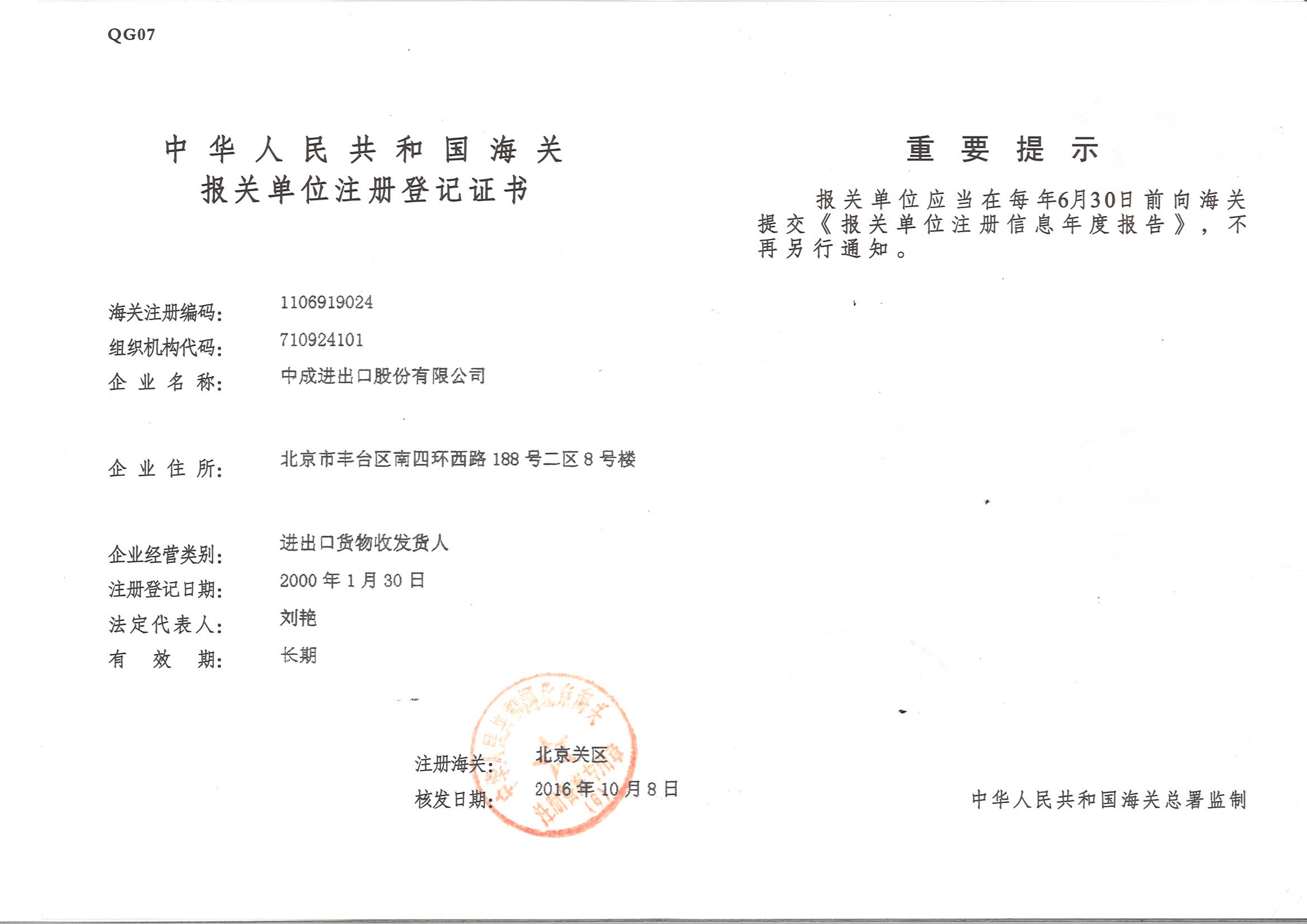 中成股份报关单位注册登记证书