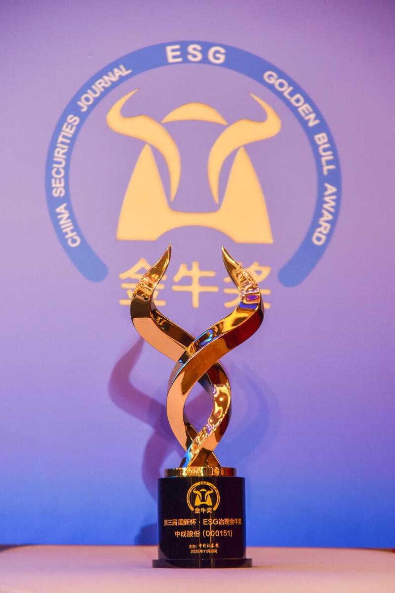 11 月 26 日,由中国证券报和中国国新联合主办的“2025 年金牛企业可持续发展论坛暨第三届国新杯·ESG金牛奖颁奖典礼”在苏州举行,中成股份凭借在可持续发展与ESG 治理方面的卓越表现,再度斩获“ESG治理金牛奖”。连续三年荣获金牛系列奖项,充分彰显了公司在环境、社会及公司治理方面的优秀实践。